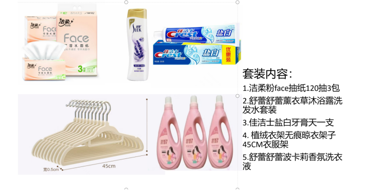 实用生活用品套装(纸巾、牙膏、牙刷、沐浴露、洗发水、衣架,都是开学最需要的"刚需");